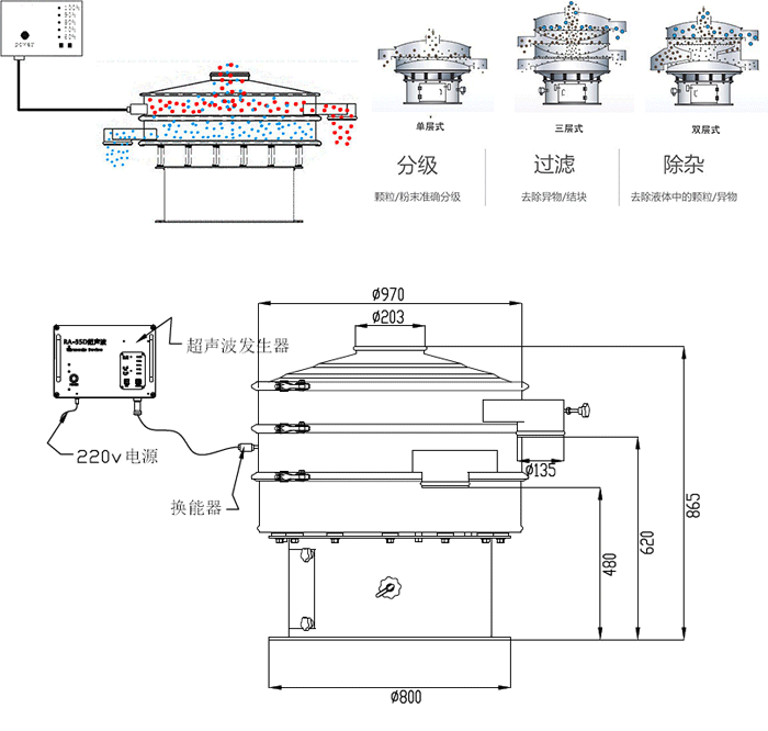 分離式結構,重量輕。具有共振環,效果好,篩網壽命長。